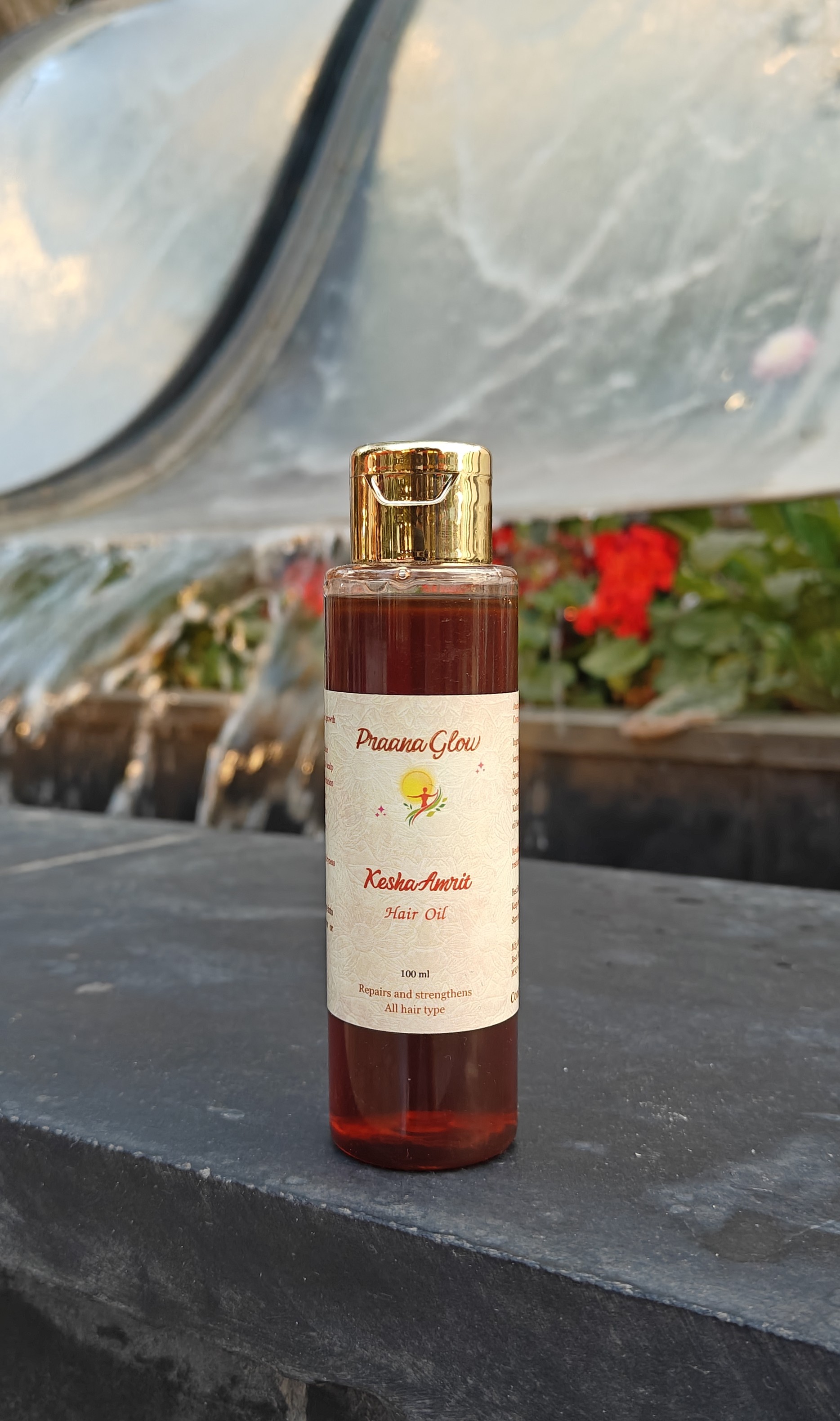 Kesha Amrit Hair Oil is crafted through classical Ayurvedic Taila Paka method. Carefully selected herbs—Neem, Curry leaves, Hibiscus, Bhringraj, and 12+ traditional ingredients are including fresh and dried hers are extracted in water stone-ground into paste, then slowly infused into sesame-coconut oil base over gentle heat. Continuous stirring extracts maximum herbal potency as froth forms and water evaporates. After hours of slow cooking, rosemary oil completes the aroma. The oil is multiply strained through muslin cloth for purity, cooled naturally and then packed.
