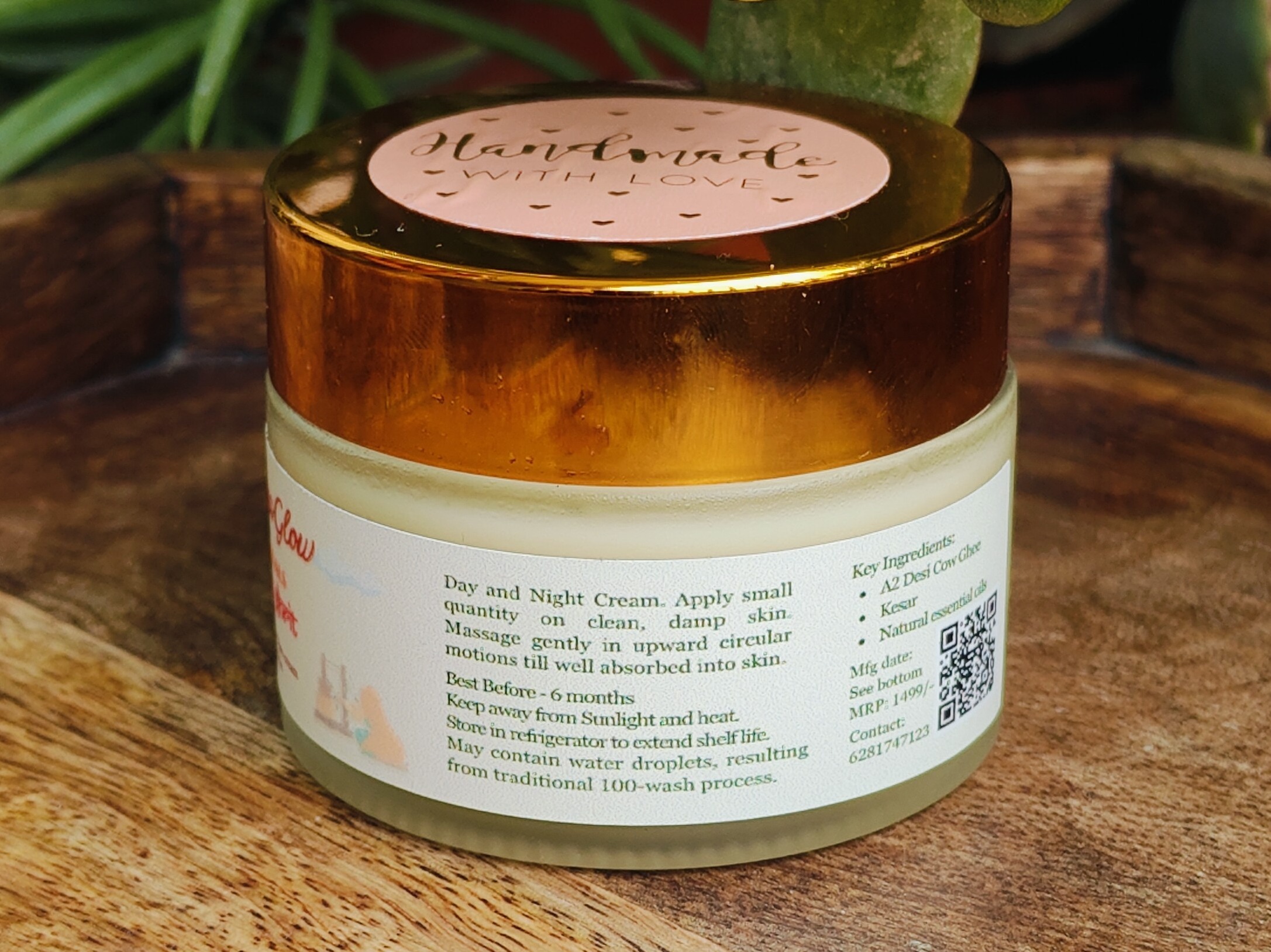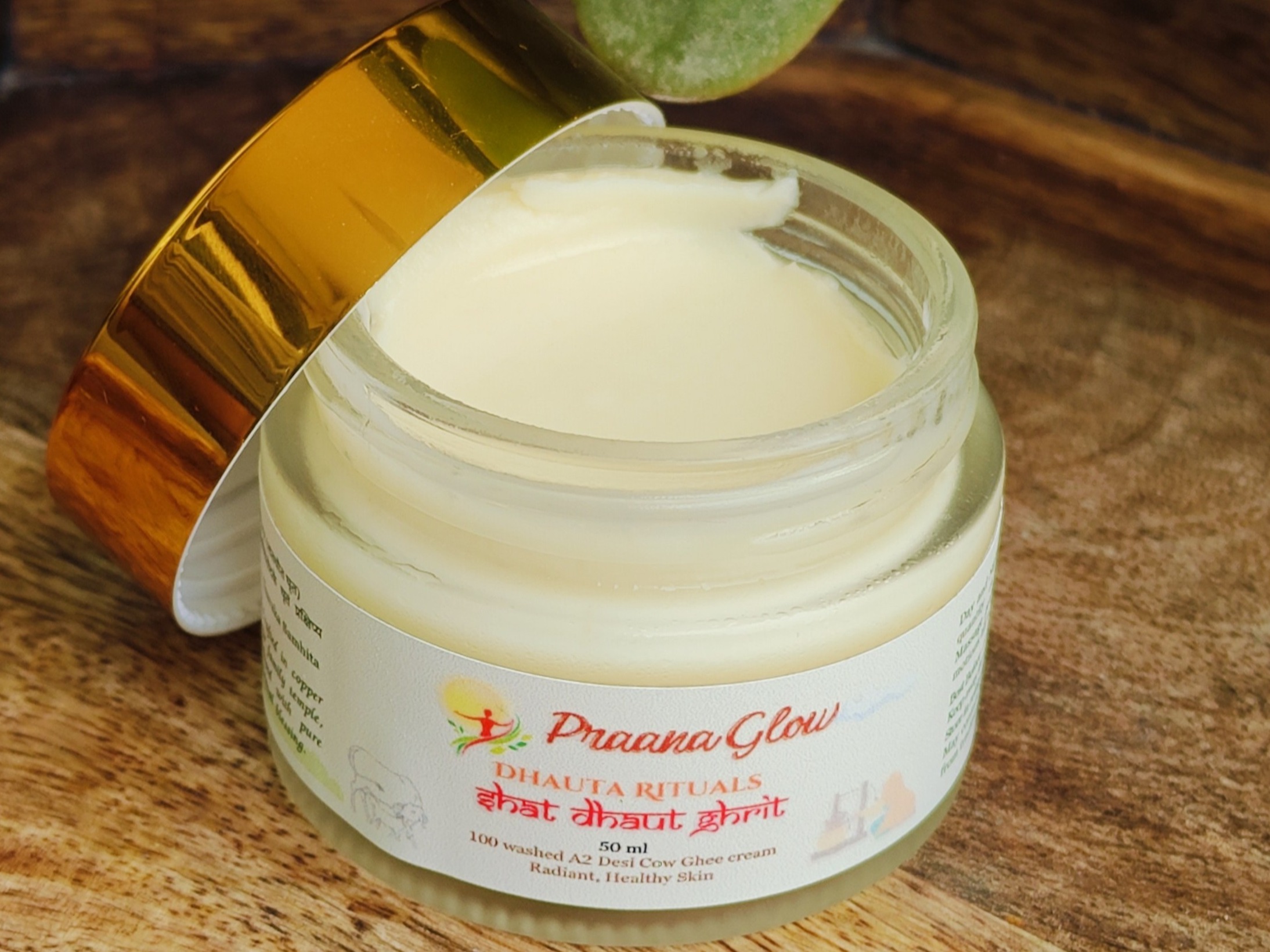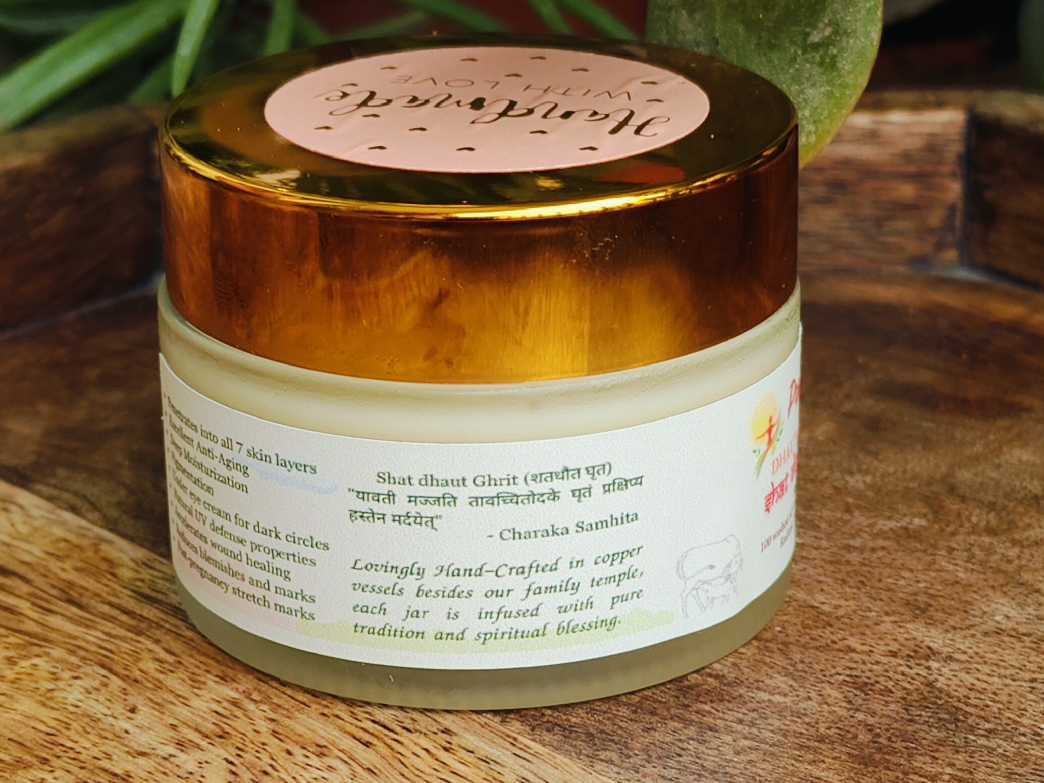 Our Shat Dhaut Ghrit begins with pure A2 desi cow ghee, which is gently washed 100 times with cool water in traditional copper vessels, following the method described in classical Ayurvedic texts. Through slow, repetitive hand-churning, the ghee gradually transforms into a soft, cream-like texture that feels cool, light, and silky on the skin. After the washing is complete, we blend in saffron (kesar) and carefully chosen natural essential oils, then fill each jar in small batches in our home studio